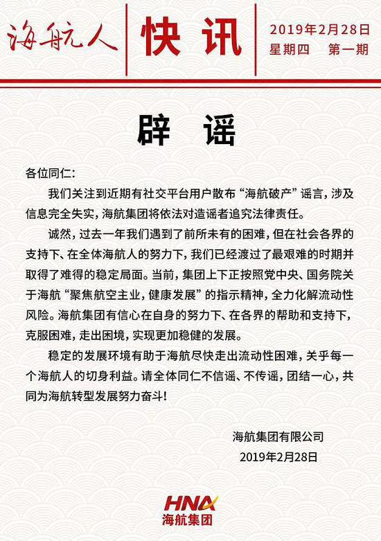 我們關(guān)注到近期有社交平臺用戶散布“海航破產(chǎn)”謠言,涉及信息完全失實,海航集團將依法對造謠者追究法律責(zé)任。誠然,過去一年我們遇到了前所未有的困難,但在社會各界的支持下、在全體海航人的努力下,我們已經(jīng)渡過了最艱難的時期并取得了難得的穩(wěn)定局面。當(dāng)前,集團上下正按照黨中央、國務(wù)院關(guān)于海航“聚焦航空主業(yè),健康發(fā)展”的指示精神,全力化解流動性風(fēng)險。海航集團有信心在自身的努力下、在各界的幫助和支持下,克服困難,走出困境,實現(xiàn)更加穩(wěn)健的發(fā)展。穩(wěn)定的發(fā)展環(huán)境有助于海航盡快走出流動性困難,關(guān)乎每個海航人的切身利益。請全體同仁不信謠、不傳謠,團結(jié)一心,共同為海航轉(zhuǎn)型發(fā)展努力奮斗!