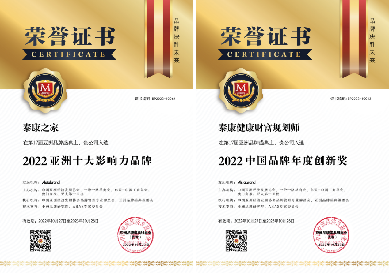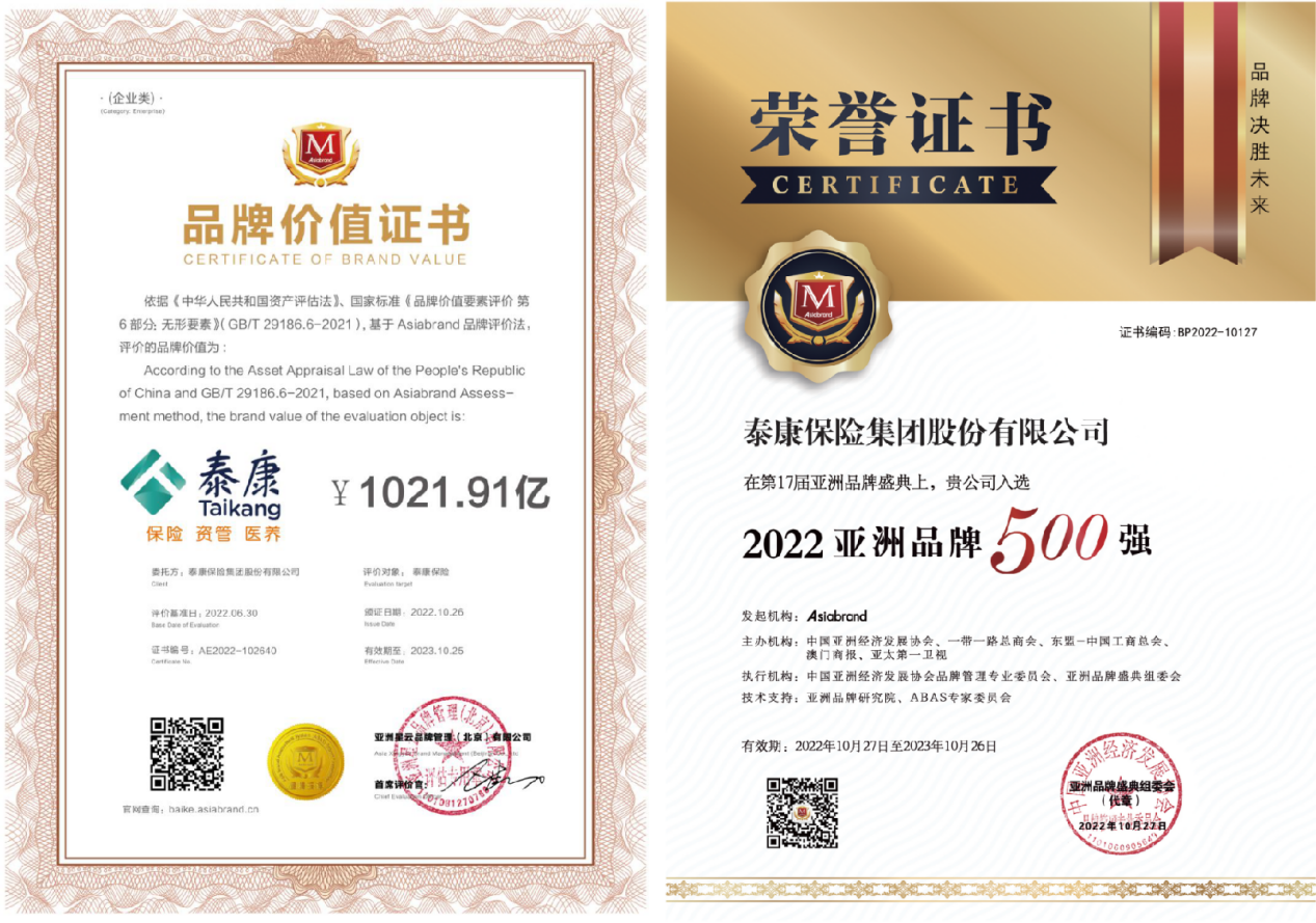 踔厲奮發(fā),砥礪前行。10月27日,專業(yè)品牌評(píng)價(jià)機(jī)構(gòu)Asiabrand發(fā)起主辦,中國(guó)亞洲經(jīng)濟(jì)發(fā)展協(xié)會(huì)、一帶一路總商會(huì)、東盟-中國(guó)工商總會(huì)、澳門商報(bào)、亞太第一衛(wèi)視聯(lián)合主辦的第17屆亞洲品牌盛典暨亞洲品牌500強(qiáng)發(fā)布會(huì)在海南自貿(mào)港隆重舉行。泰康保險(xiǎn)集團(tuán)以1021.91億元的品牌價(jià)值上榜,躍升17位,榮居第99位,這是泰康連續(xù)9年登上該榜單,同時(shí)泰康保險(xiǎn)集團(tuán)創(chuàng)始人、董事長(zhǎng)兼CEO陳東升榮膺“2022亞洲品牌年度人物”榮譽(yù)稱號(hào),泰康之家榮獲“2022亞洲十大影響力品牌”,泰康健康財(cái)富規(guī)劃師榮獲“2022中國(guó)品牌年度創(chuàng)新獎(jiǎng)”。
